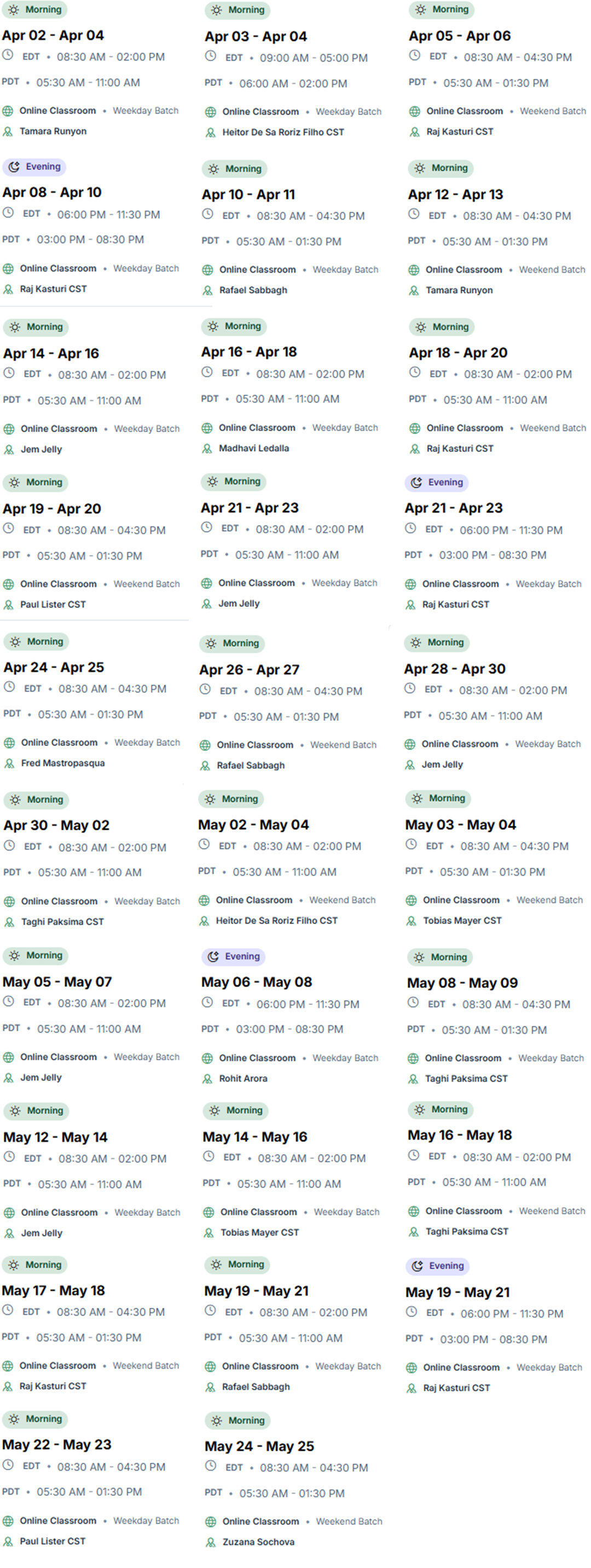 We're thrilled to have you on board for the Certified Scrum Master (CSM) training. This program is designed to equip you with essential Learning Tree Global and Scrum skills. Below are the available dates and times for our upcoming sessions: