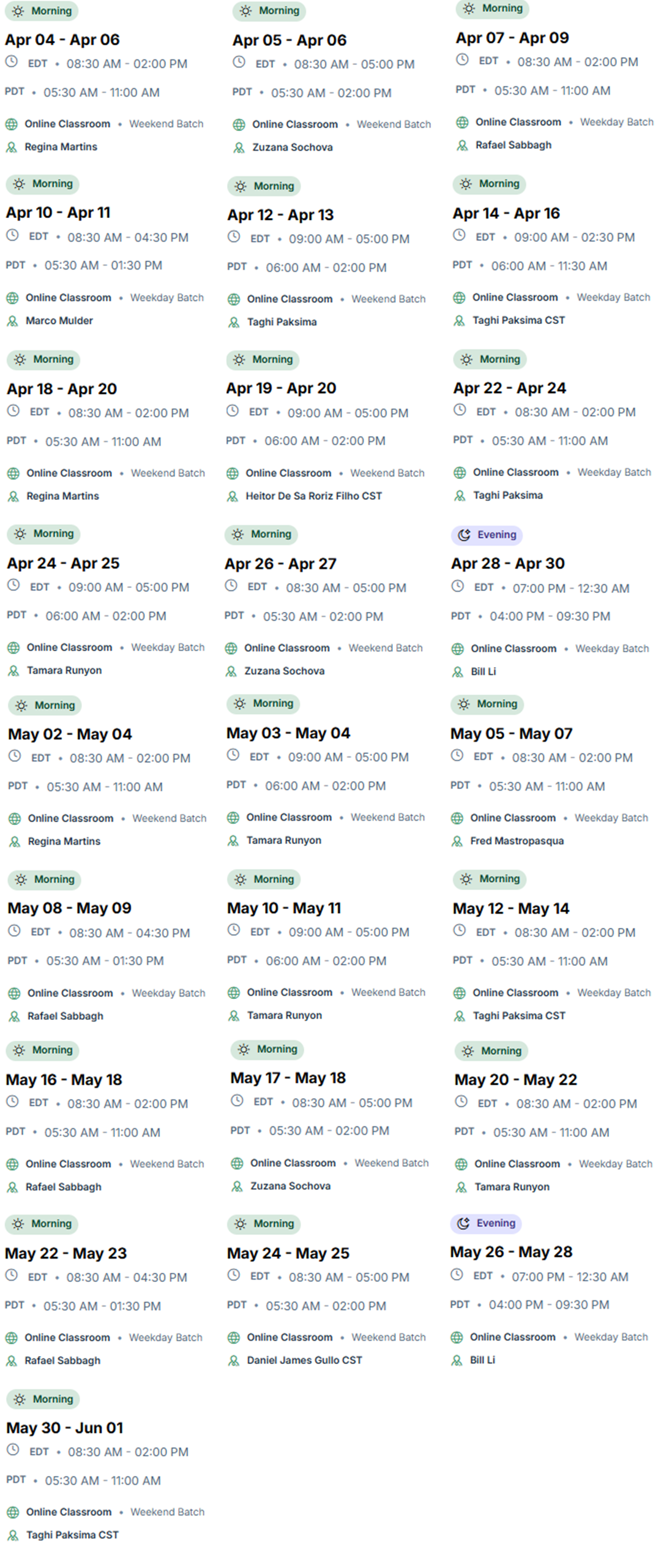 We're thrilled to have you on board for the Certified Scrum Product Owner (CSPO) training. This program is designed to equip you with essential Agile and Scrum skills. Below are the available dates and times for our upcoming sessions: